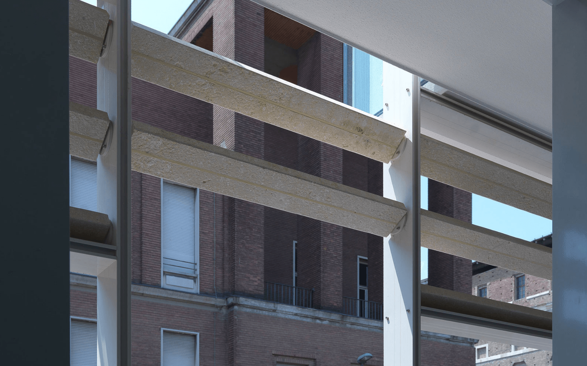 Paolo Pagani designed a double façade for the Duchessa Margherita Residence. A functional inner wall with big windows and a second outer wall consisting of a grid made up of Vicenza stone strips with aluminium uprights giving the new construction a non-invasive look and an underlining dialogue with the heritage buildings around it, Palazzo Farnese (completed in 1602) and Melchiorre Gioia school (1930).