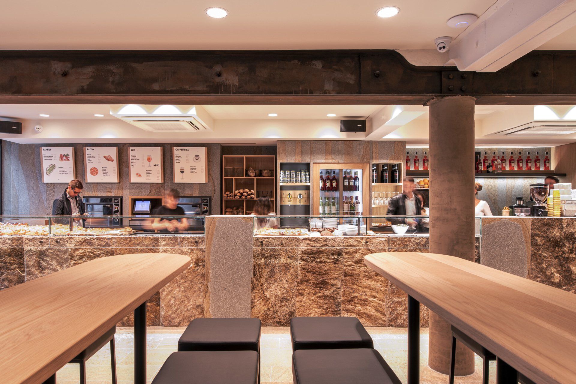 The main counter and its cladding give the distinctive aesthetic to the entire space aiming at re-creating the sensorial experience of the bakery. The vision of the bread, its perfume and the roughness and colour of its crust.