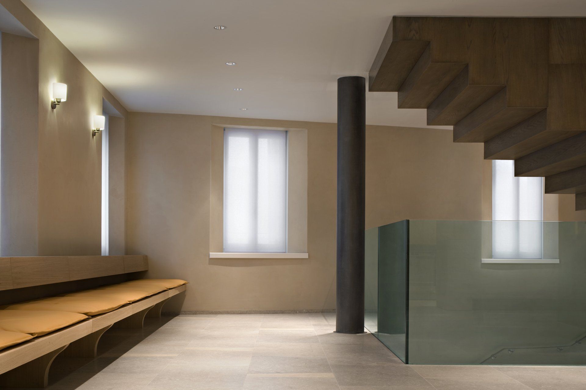 All floors, internal staircases and claddings are in Grigio Alpi and Giallo Dorato, finished honed, sometimes alternated to create a subtle colour and texture variation.